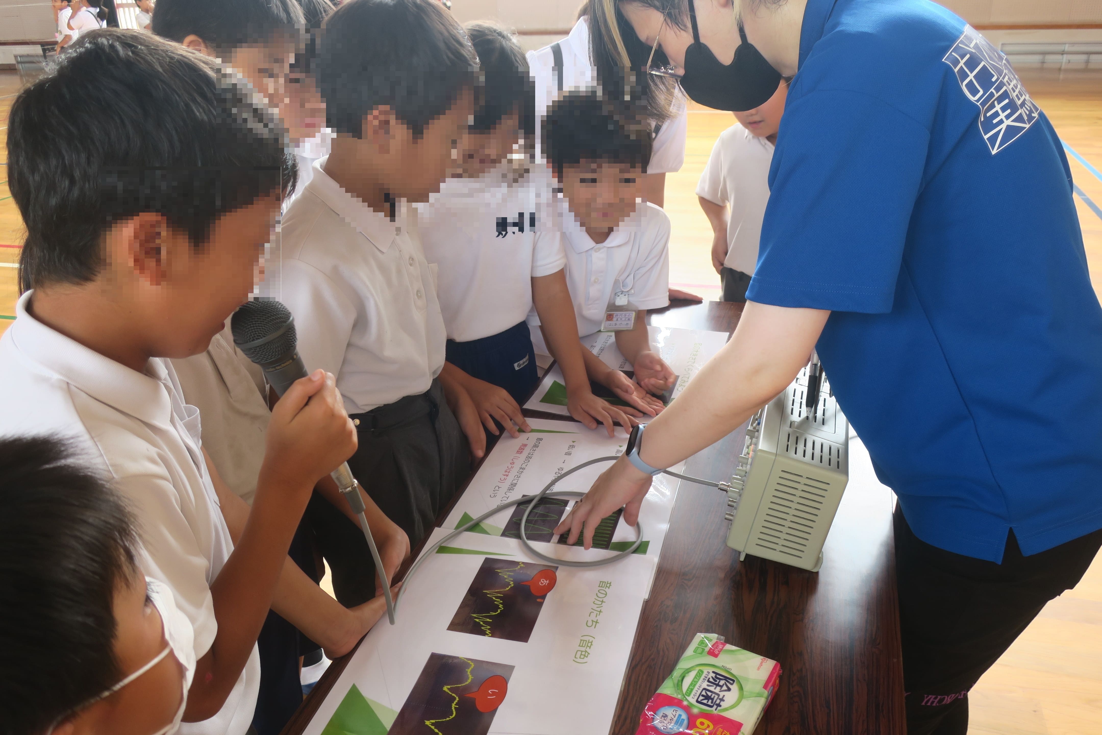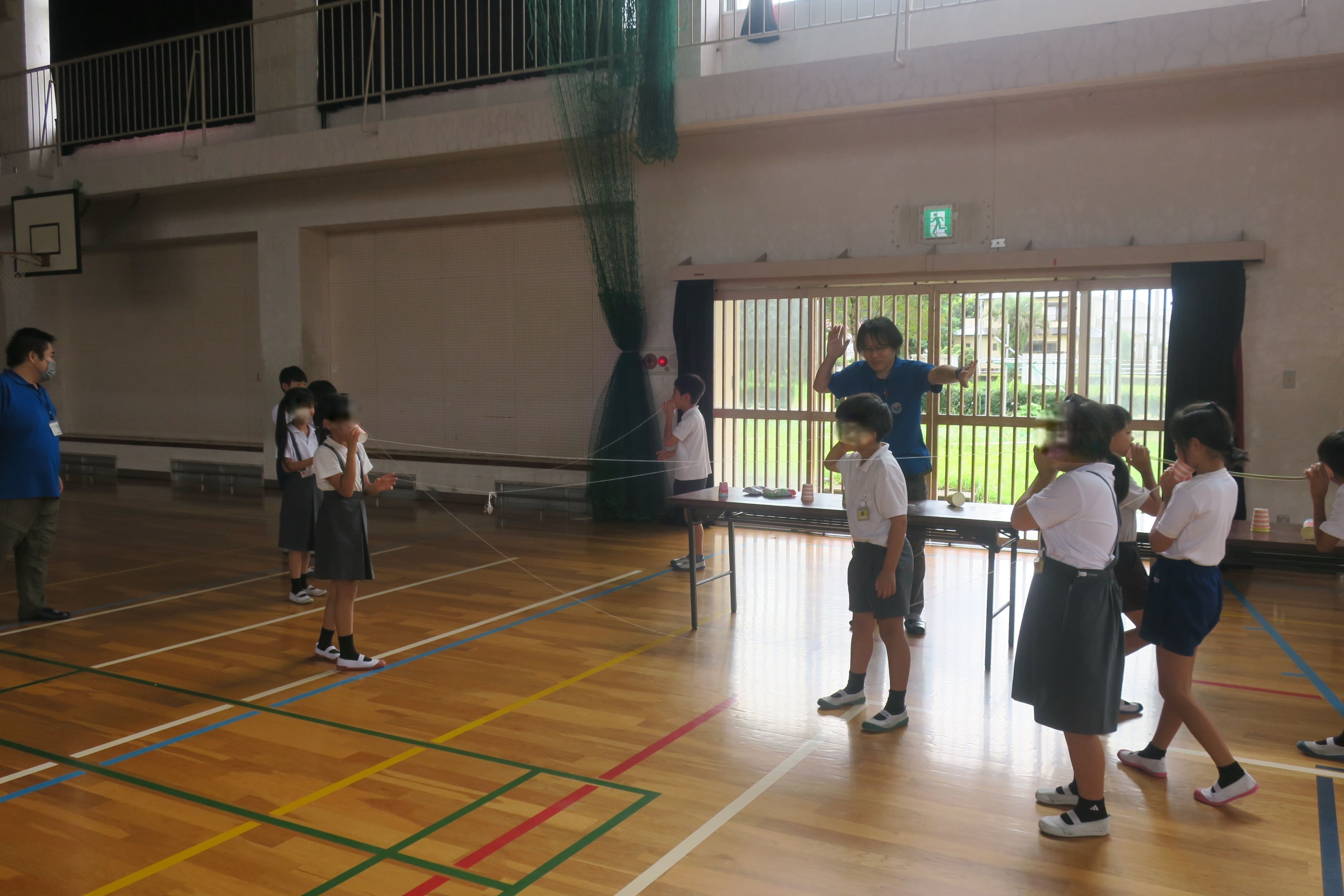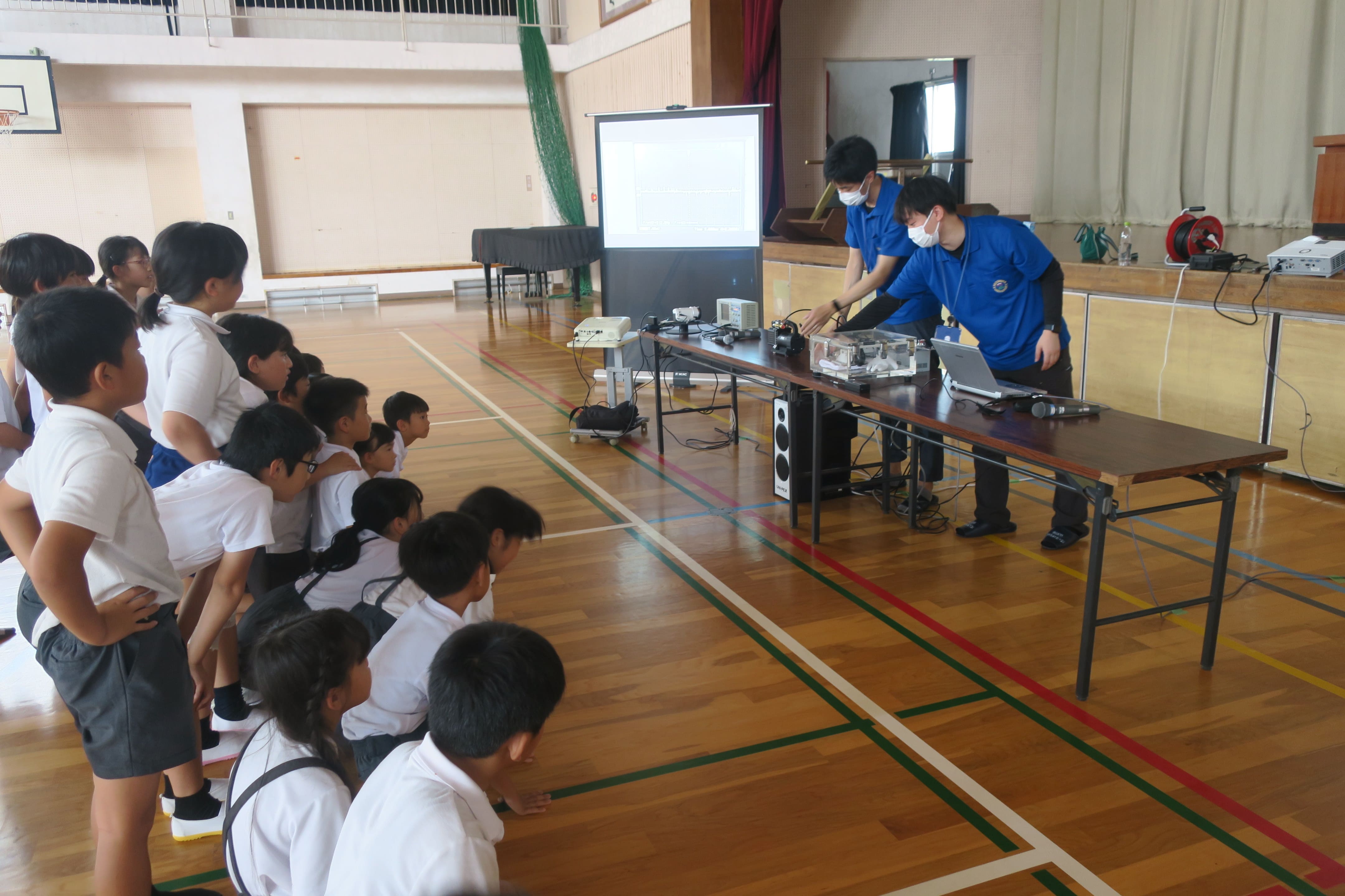 今回は、技術部から職員7名が出向き、日置市立妙円寺小学校3年生2クラス55名の児童に対して、音に関するテーマ「おとのフシギ」と「おとであそぼう」を実施しました。