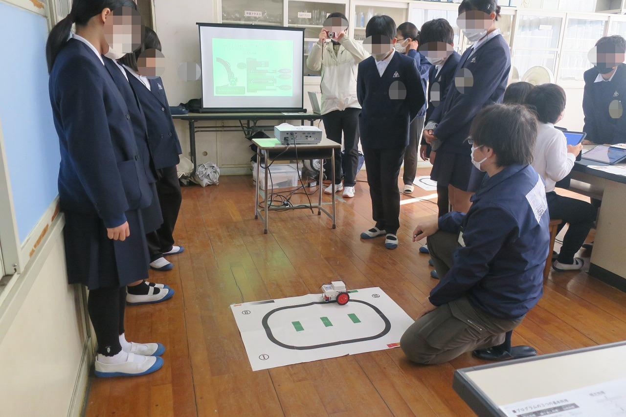 今回は、技術部から6名の職員が出向き、鹿児島市立郡山小学校6年生1クラス37名を対象に、理科室にて「信号機のプログラムをつくろう!」というテーマでプログラミングの授業を行いました。児童には1人1台ずつアーテックロボ2.0(株式会社アーテック)が準備し、タブレットを使ってロボットプログラミングを体験しました。前半は講義形式でプログラムの3つの基本処理(順次処理・繰り返し処理・分岐処理)を学び、後半は演習問題や自由制作に取り組みました。また並行して、班ごとにライントレースロボットの見学も行い、5班に分かれて順番に体験しました。教材にはレゴ・マインドストーム(株式会社LEGO)を使用しました。ライントレースカーは黒いラインに沿ってセンサーで黒と白を検知しながら車輪のモーターを左右に回転させて走行しており、児童たちはその仕組みを興味深く観察していました。
