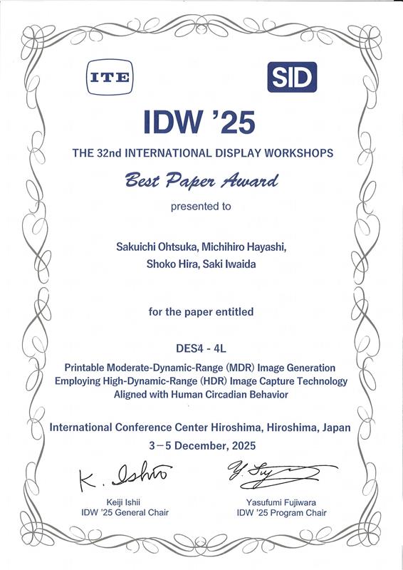 比良祥子技術専門職員の共著論文が、国際会議IDWにて「IDW ’25 Best Paper Award」を受賞しました。